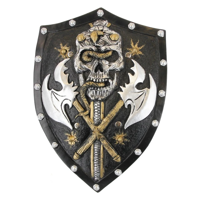 Neben einer imposanten Waffe darf vor allem eines weder Ritter noch Wikinger und Co. fehlen: ein robuster Schild, mit dem ihr euch gegen die Angriffe eurer Widersacher verteidigen könnt. Aus diesem Grund liegt ihr mit diesem goldrichtig! Dieser ist nicht nur eine gelungene Neuinterpretation des Klassikers, sondern er ist darüber hinaus auch ein echter Hingucker, mit dem euch unvergessliche Faschingsabenteuer garantiert sind. Er misst 34 x 47,5 cm und kommt mit einem schaurigen Totenkopf daher, welcher das Motto der wilden Schlacht eindrucksvoll zur Schau stellt. Aus diesem Grund eignet sich der tolle Schild hervorragend für mutige Kämpfer und solche, die ihrer Fantasie an Fasching gerne freien Lauf lassen. Also schnappt ihn euch und kämpft munter drauflos!