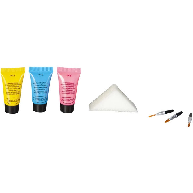 - Lieferumfang: 1 Set, bestehend aus drei Farben, drei Applikatoren, einem Schwämmchen sowie einer Schminkanleitung